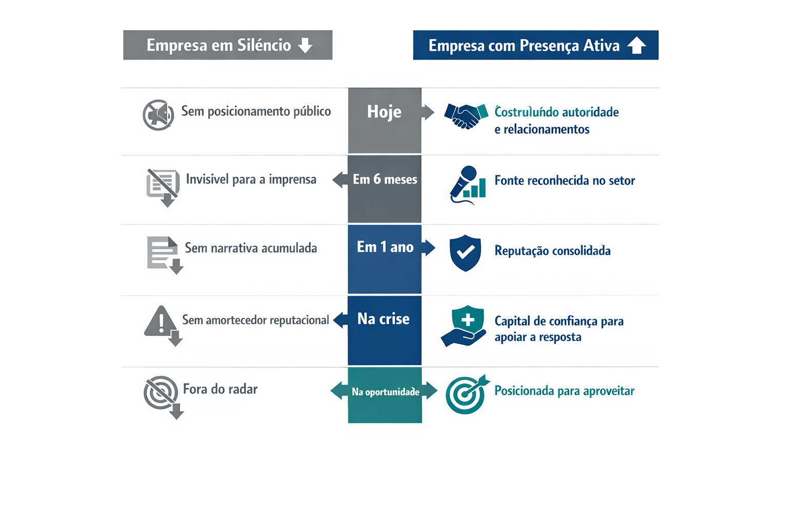 O silêncio, nesse contexto, não é proteção. É ausência. E ausência tem custo, só que um custo diferido, que aparece na hora em que a empresa mais precisa de presença.